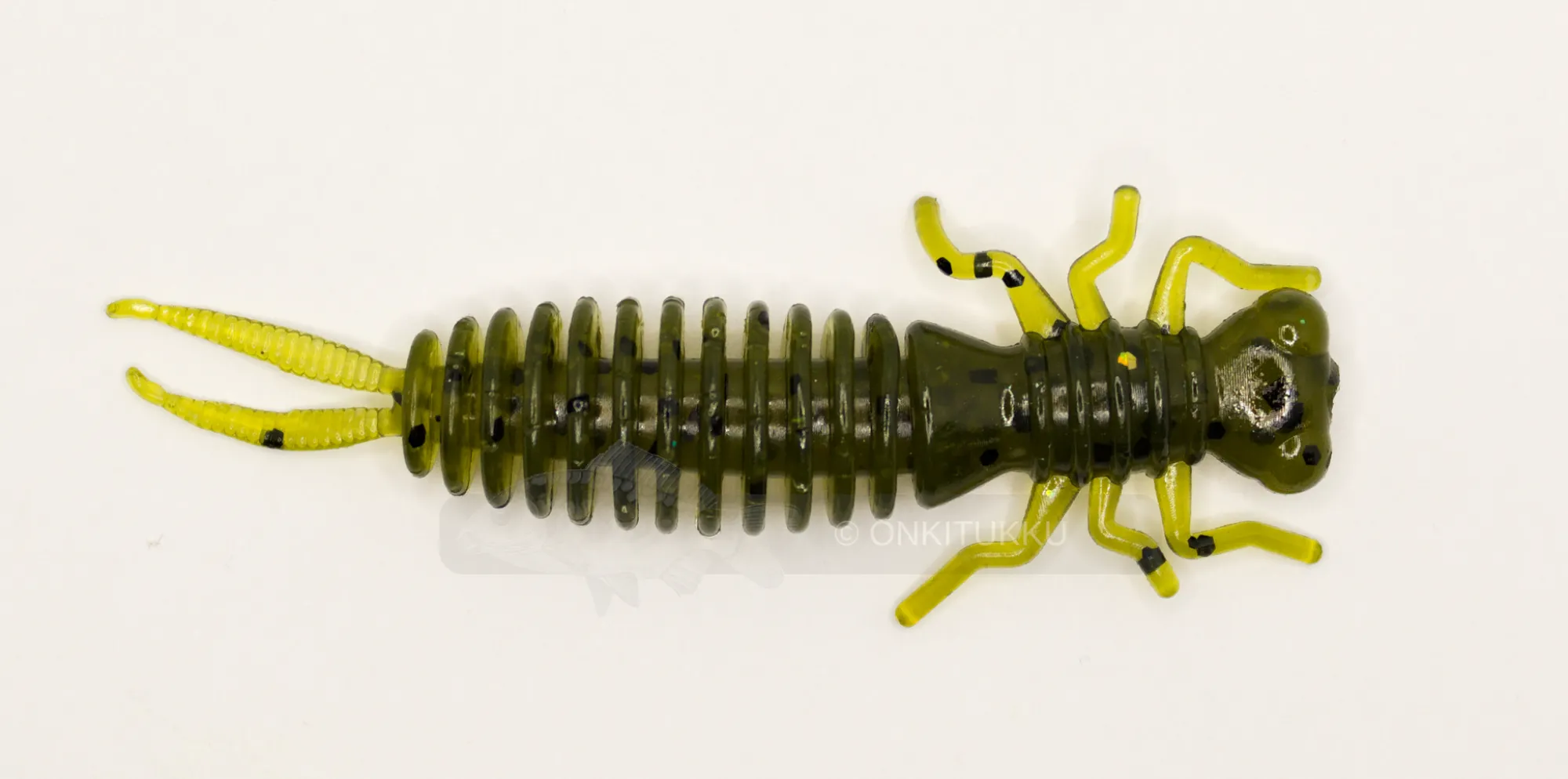 Läpikuultava vihreä uritettu ötökkäjigi mustilla hileillä.Pituus 6,5 cmMäärä 4 kpl
