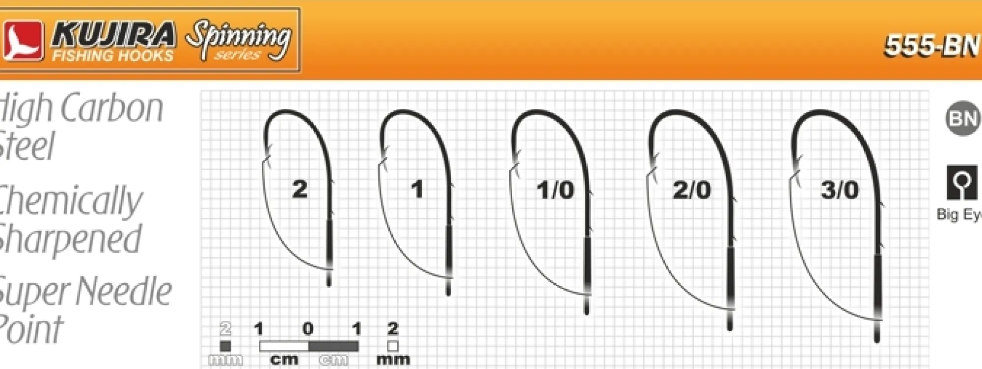 Mustan nikkelin värinen kemiallisesti teroitettu hiiliteräksinen ruohosuojattu koukku missä on pitkä varsi väkäsillä ja lenkillä.