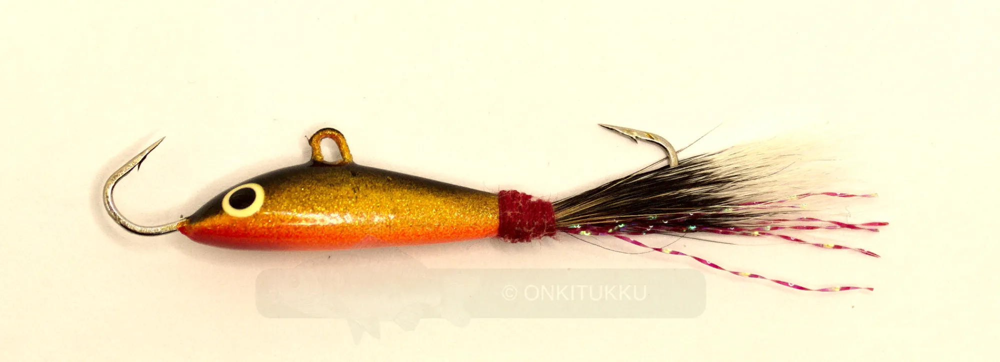 Pitkäliukuinen tasapainopilkki aidolla karvapyrstöllä. Toimii erittäin hyvin ahvenelle kesällä ja talvella. Kemiallisesti teroitetut VMC:n koukut. Erittäin hieno ja laadukas maalausjälki moninkertaisen lakan alla. Karvapyrstö on pakkasen kestävää.