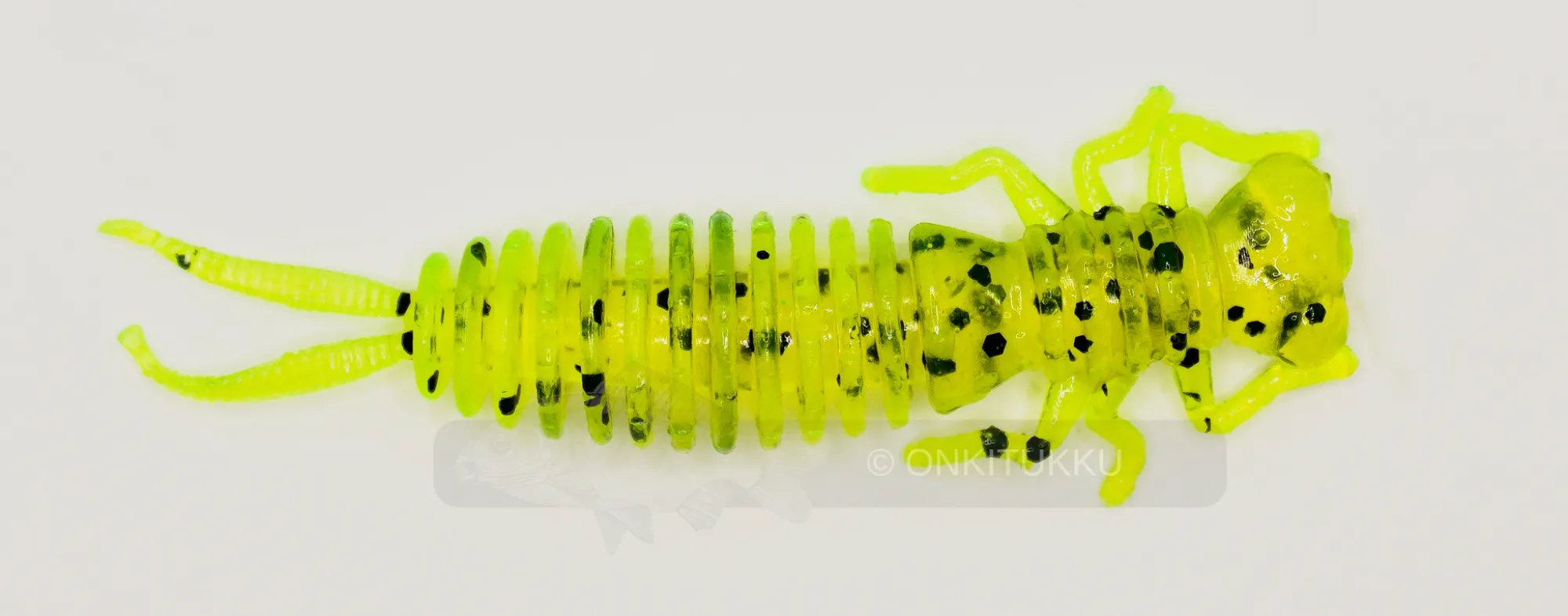 Läpikuultava vihreä uritettu ötökkäjigi mustilla hileillä.Pituus 5 cmMäärä 5 kpl