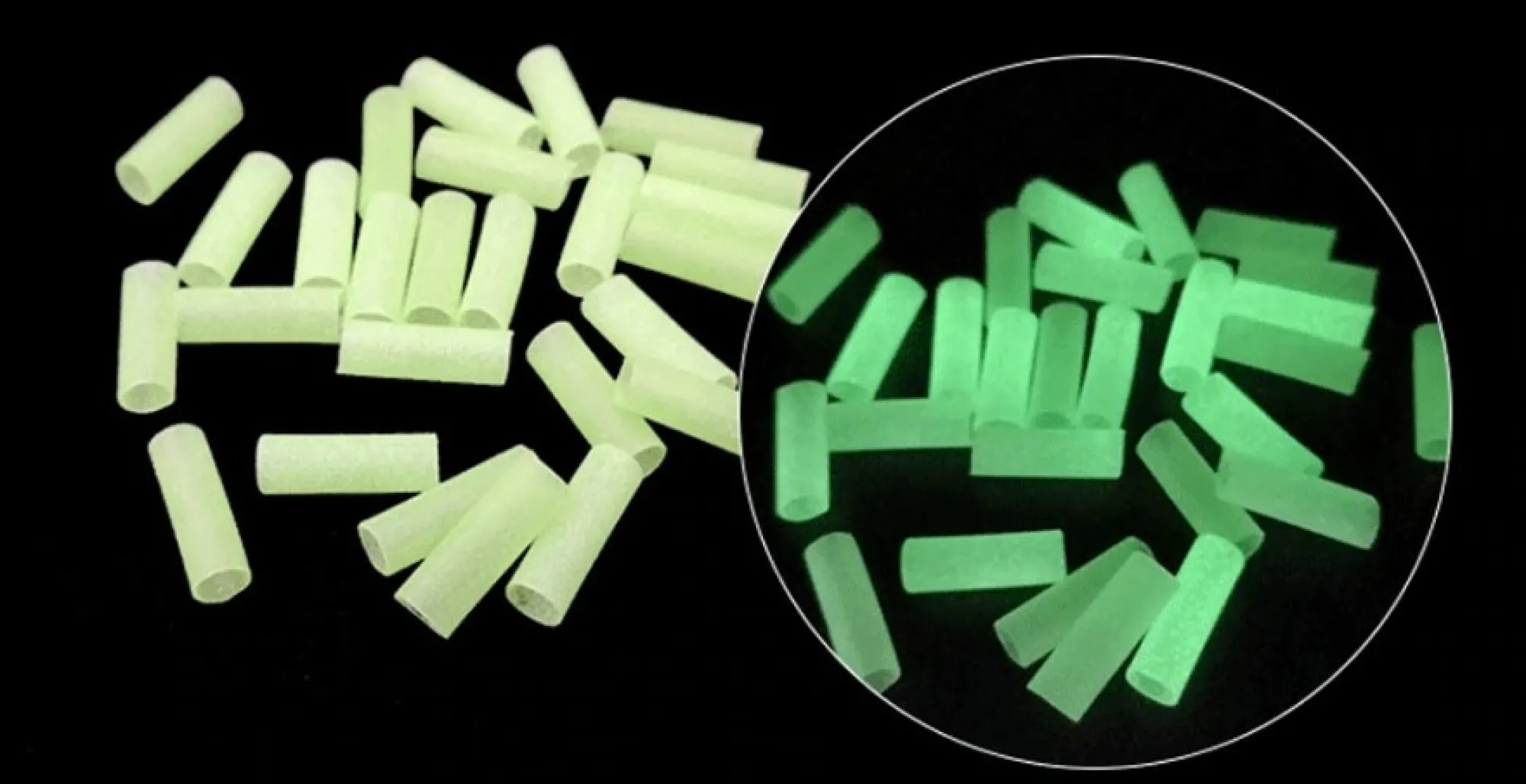 Vaaleanvihreitä hehkuvia kutistesukkia. Paketissa on 40kpl, 1,5cm pitkiä letkun pätkiä.