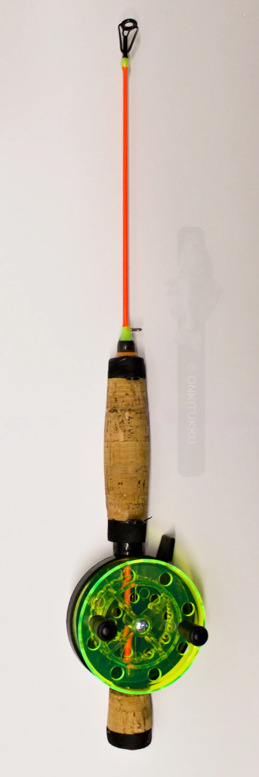 Modattu Delfin 70 mm pilkkivapa. Lasikuituvapa-aihio koko ongen mittainen ja kahva vahvistettu hiilikuituputkella. Kela on kahvan takana. Kädensijan molemmissa päissä vaparenkaat Sopii hyvin lohiongeksi sekä tasurointiin. Oranssikärkinen on hieman notkeampi versio kuin vihreäkärkinen. Puolan väri voi olla keltainen tai vihreä.