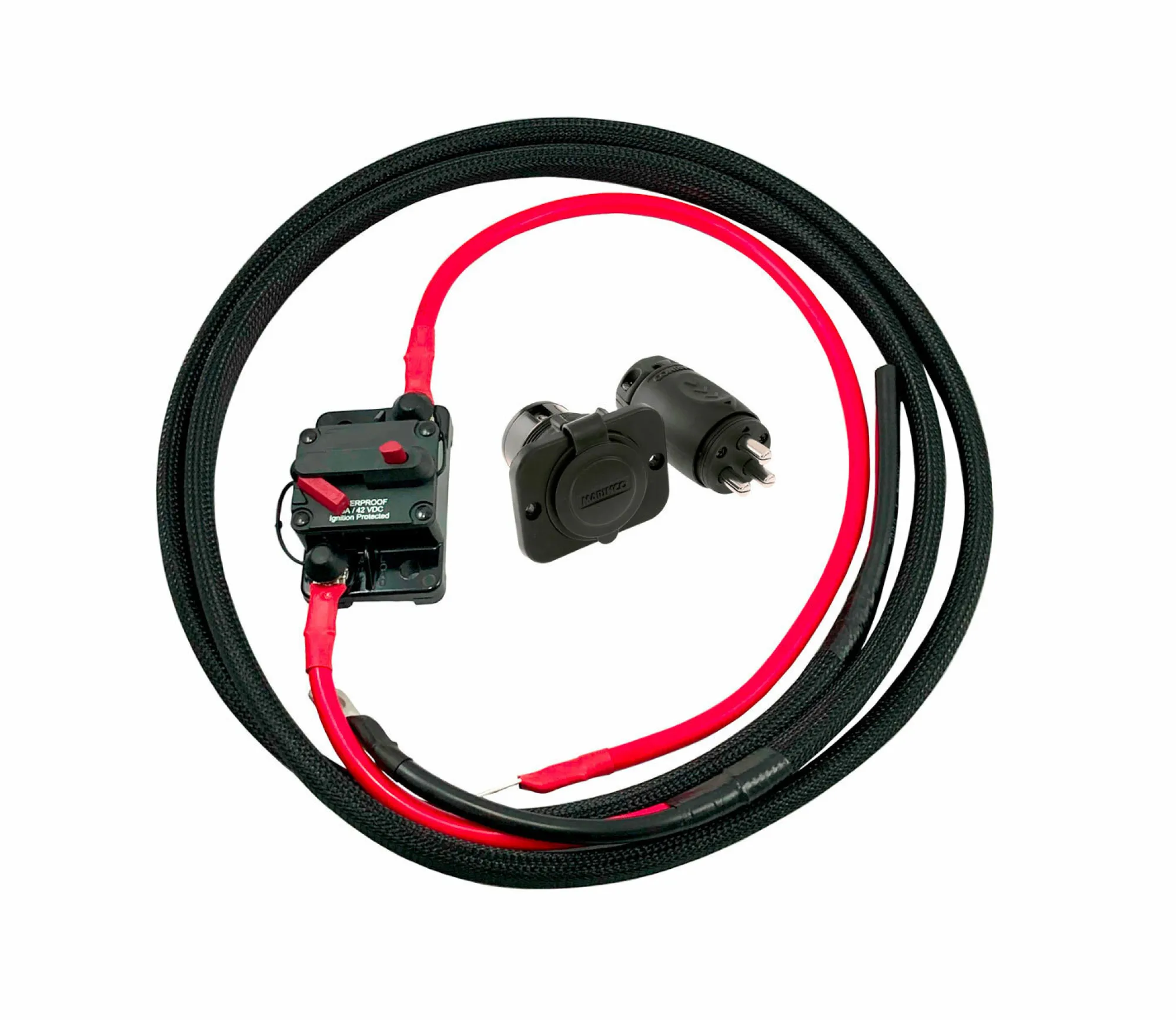 Valmis johtosarja esipuristetulla tinatulla kaapelilla asennuksen helpottamiseksi. Mukana vedenpitävä Marinco 70 A vir…