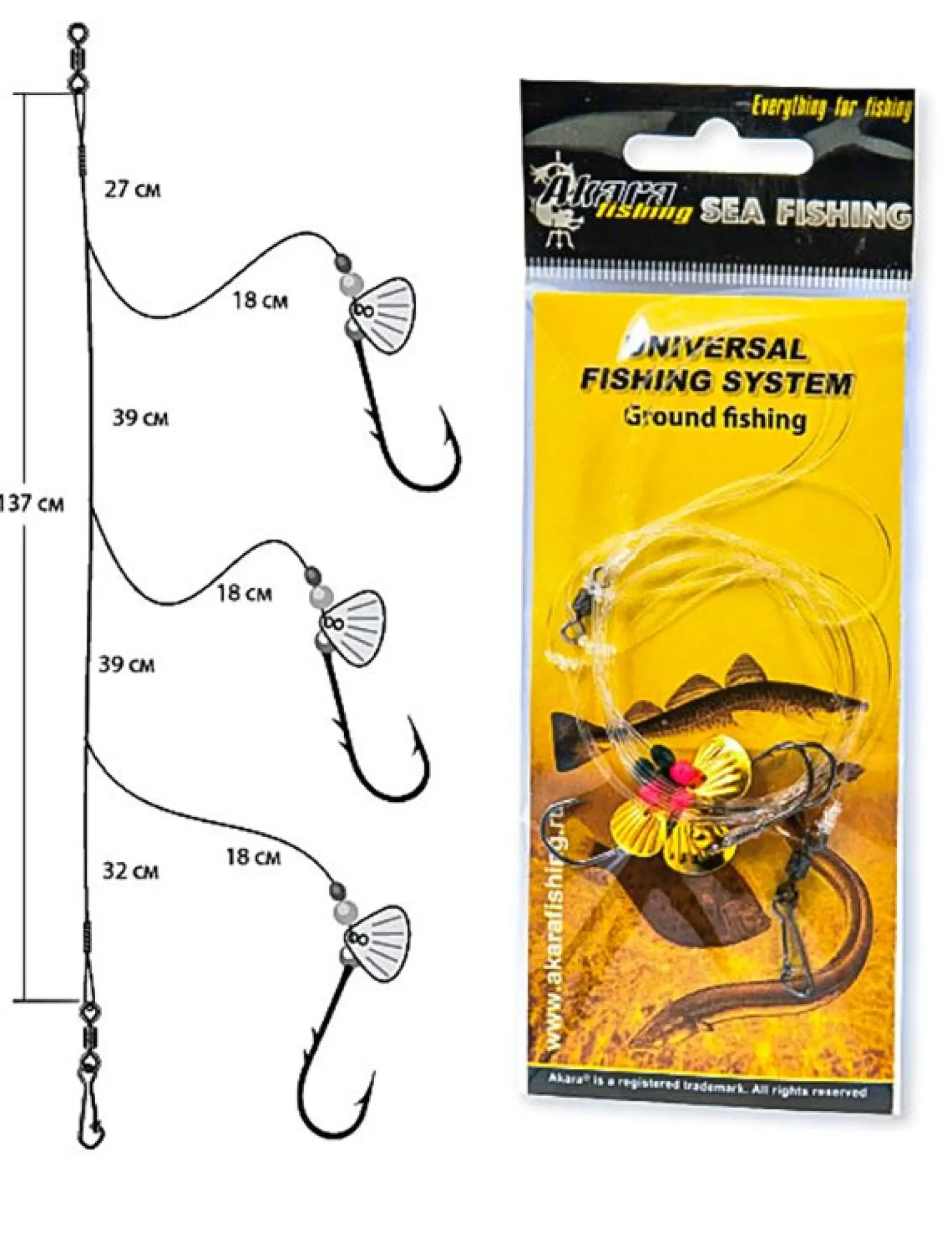Litka kolmella perukella missä helmiä, houkutuslevy ja koukku. Koukun koko: 2/0 Siiman paksuus 0,4 mmPituus 137 cm