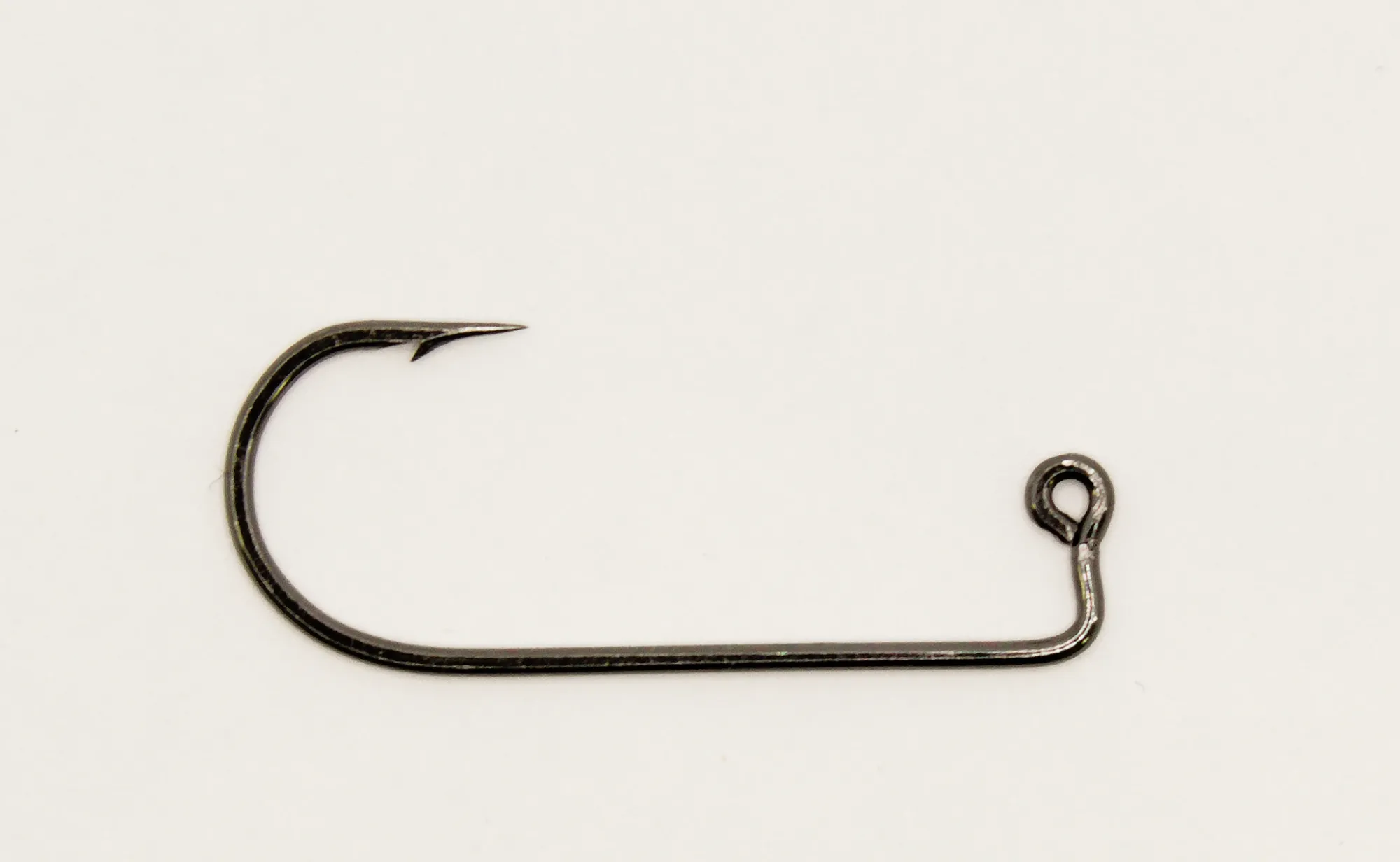 Hiiliteräksinen terävä jigikoukku jonka lenkki on käännetty 90 astetta.