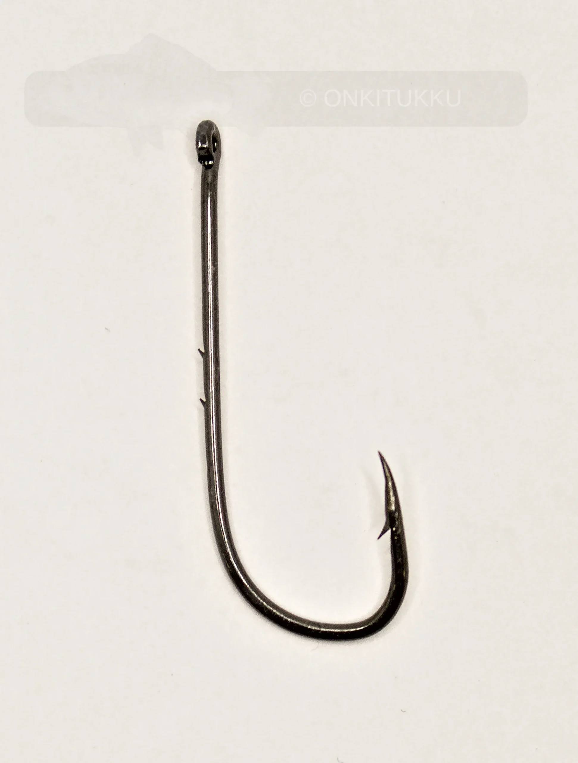 Kemiallisesti teroitettu hiiliteräksinen sivuvääräkoukku missä on pitkä varsi väkäsillä ja lenkillä.