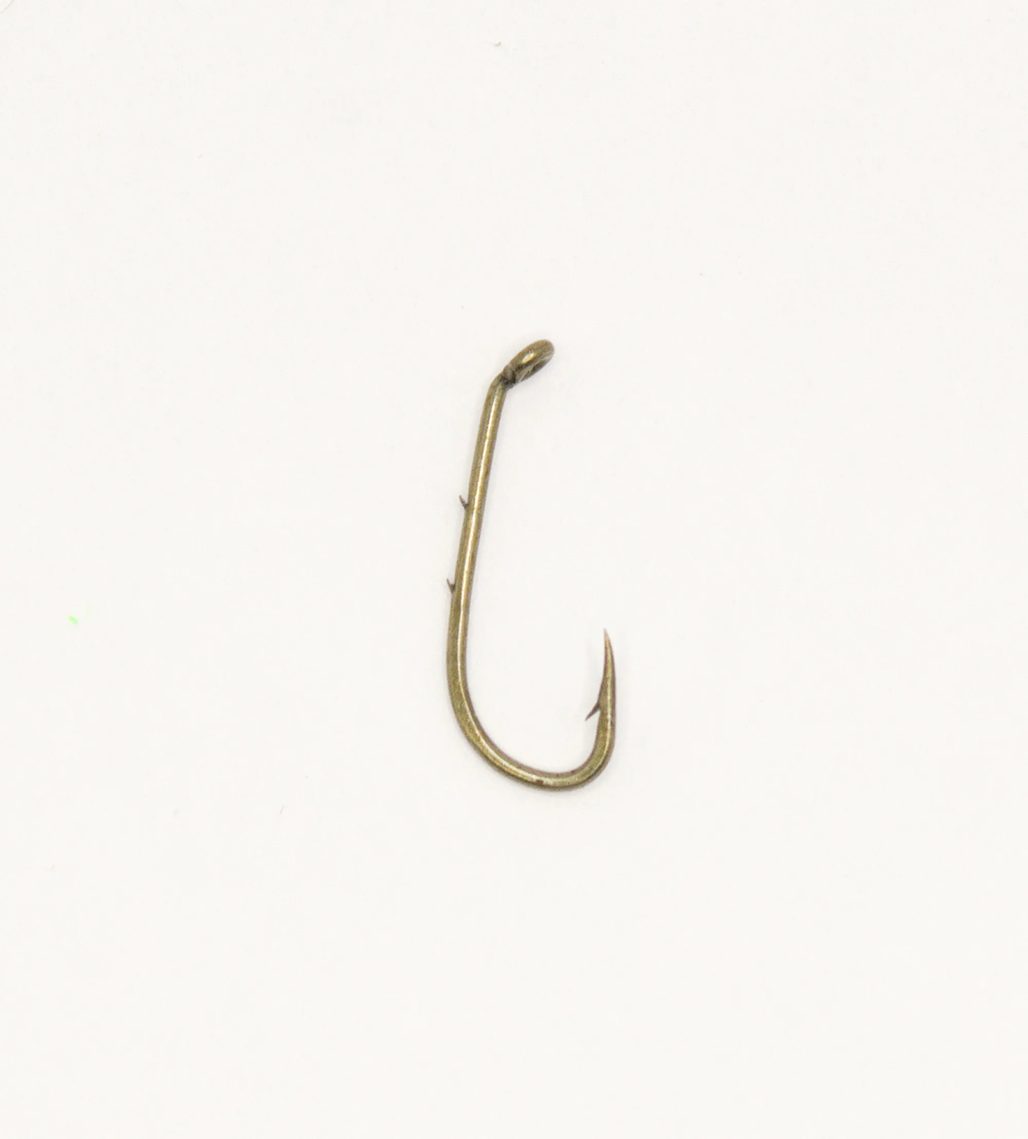 Kemiallisesti teroitettu hiiliteräksinen sivuvääräkoukku lenkillä. Koukun varressa on kaksi väkästä.