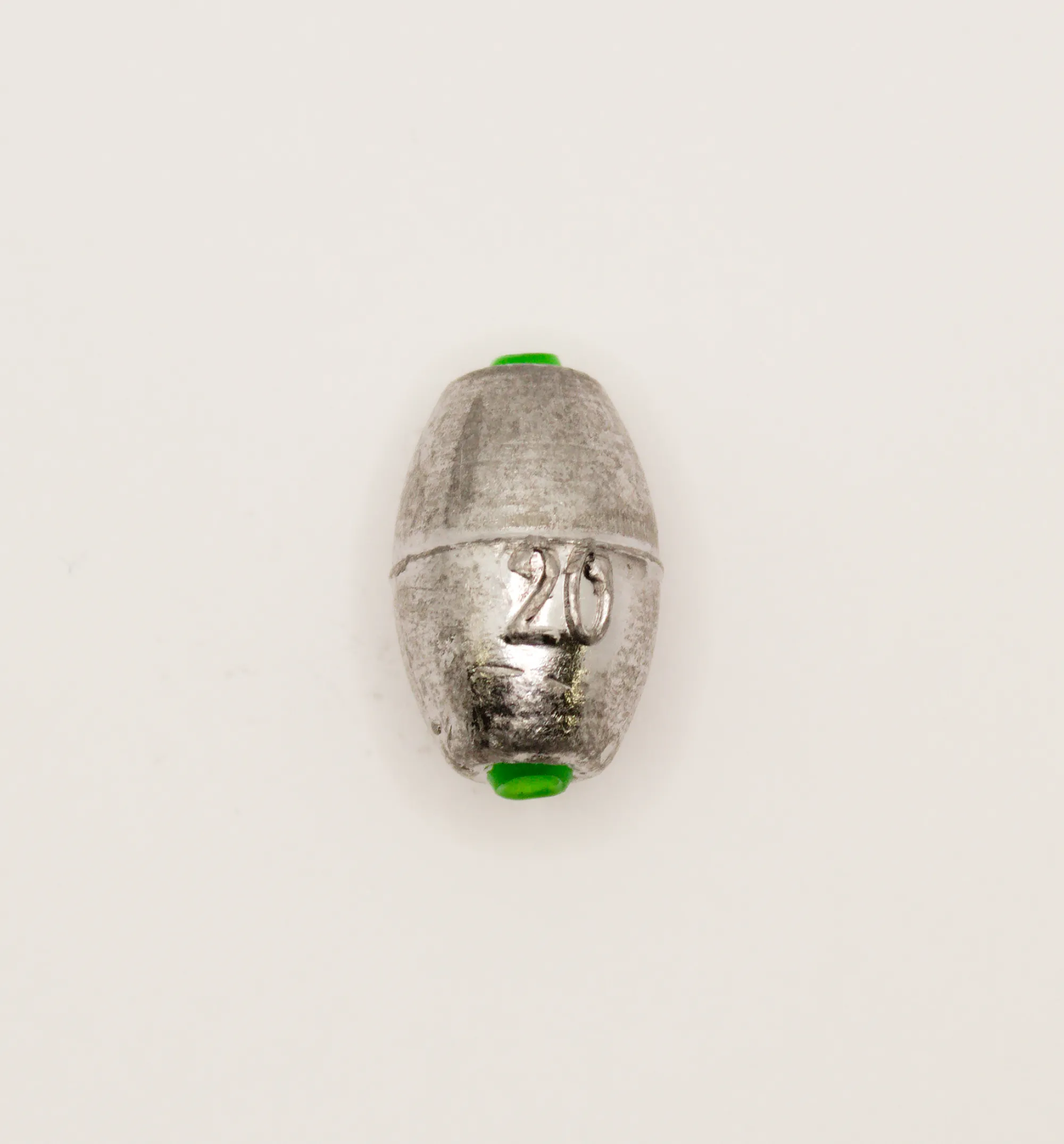 Oliivinmuotoinen liukupaino valmistettu lyijystä. Sisällä muovinen putki estämässä siiman kulumista. Painoon painettu paino 50g todellinen paino 48g