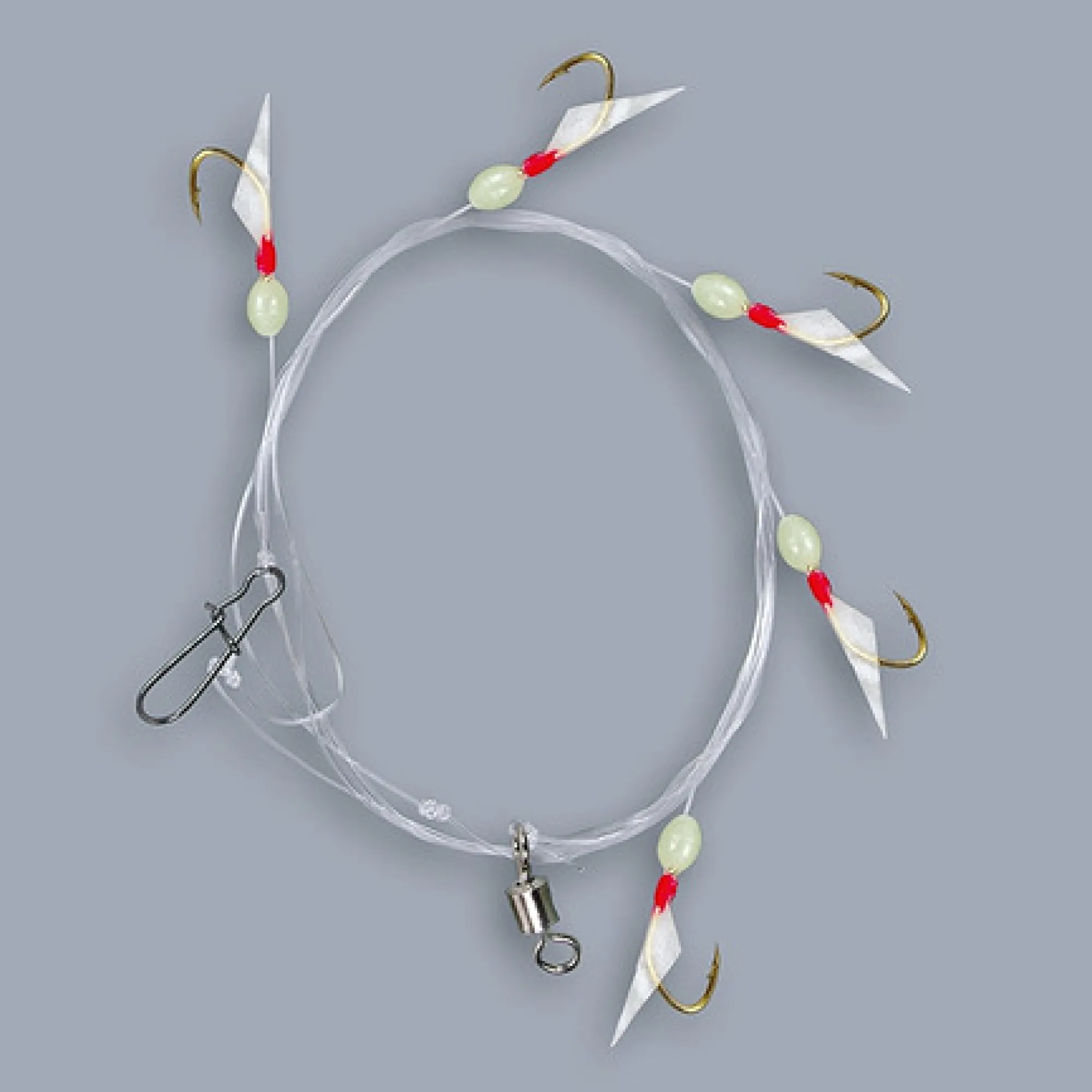 Silakkalitka viidellä kullan värisellä koukulla joiden ympärillä kalannahka imitaattio. Peruksesiimoissa fosfori helmi.