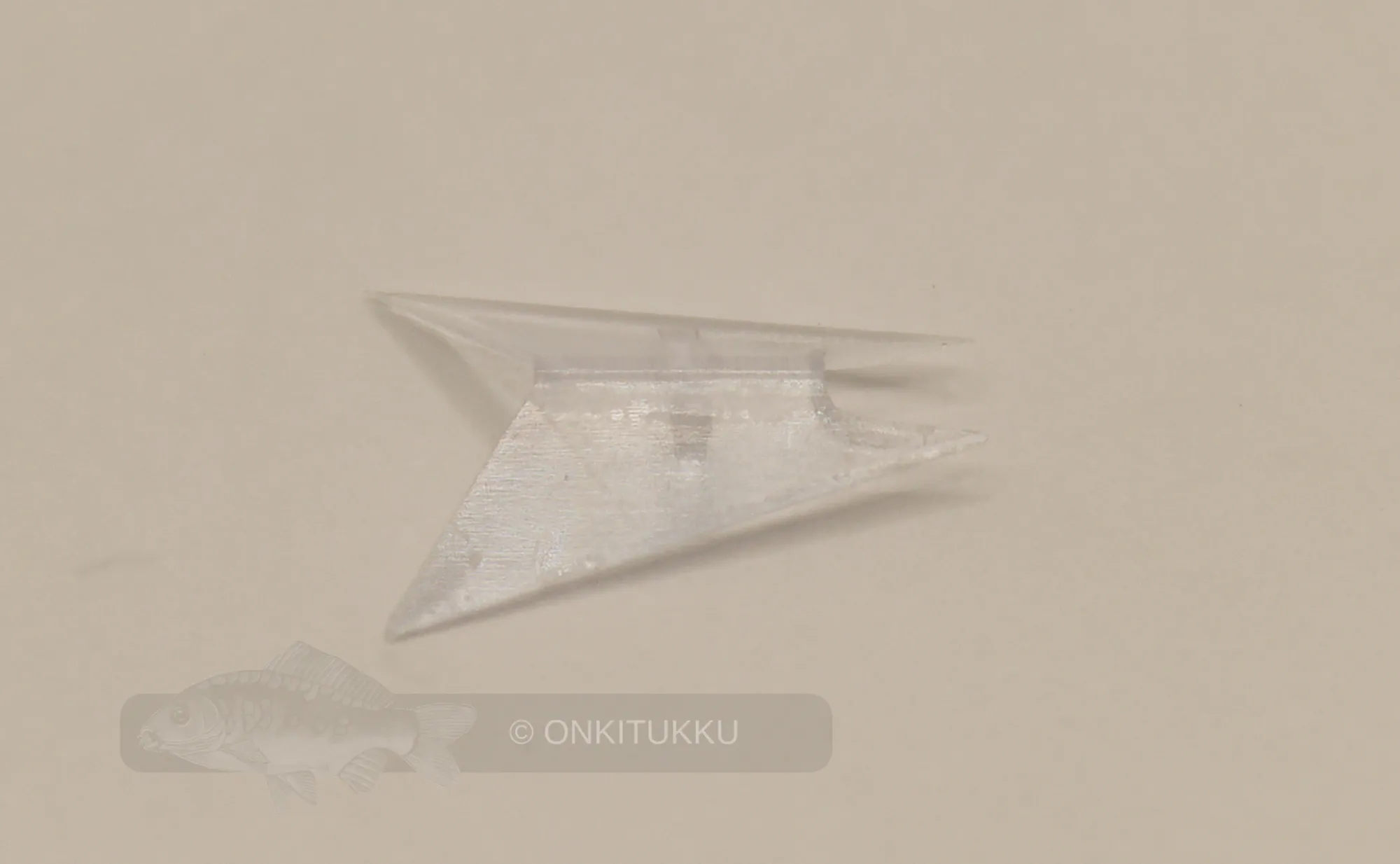 Muovinen läpinäkyvä tasapainopilkin pyrstölevy.