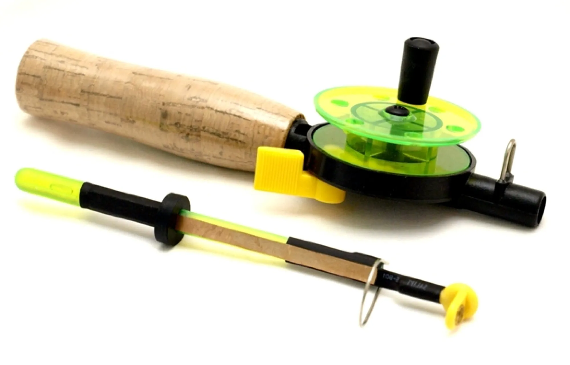 Pilkkivapa korkkikahvalla. Läpikuultava vihreä kela, pyörivällä nupilla.