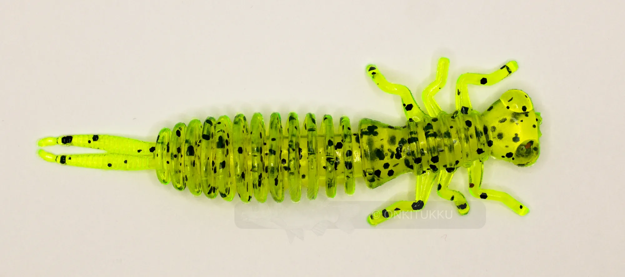 Läpikuultava vihreä uritettu ötökkäjigi mustilla hileillä.Pituus 6,5 cmMäärä 4 kpl