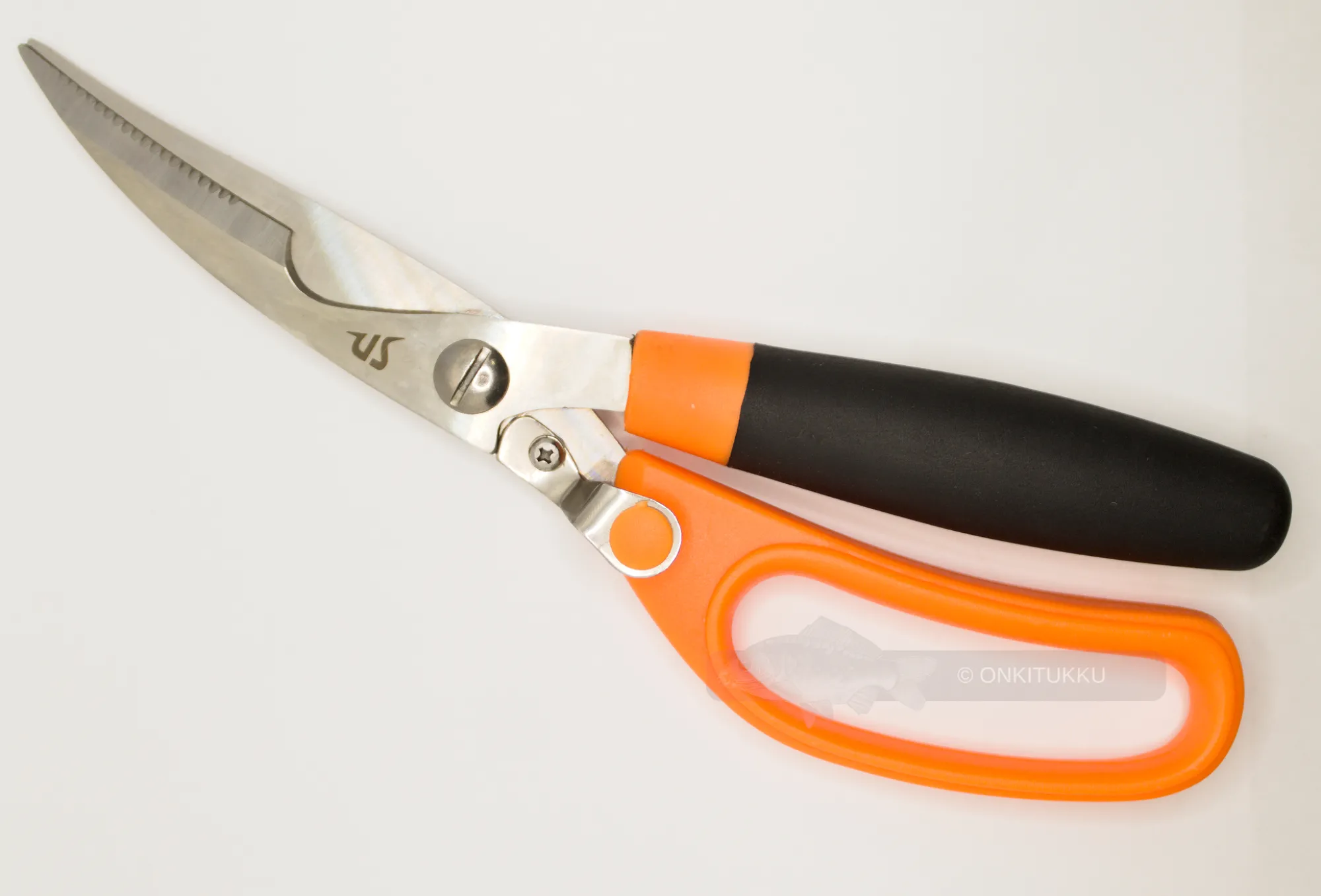 Ruostumattomat terät kaartuvat ylöspäin ja terän juuresssa oleva lovi helpottaa selkärangan katkaisua. Solukumipäällysteinen kahva takaa pitävän otteen märilläkin käsillä. Pituus 24cm (terä 8cm).