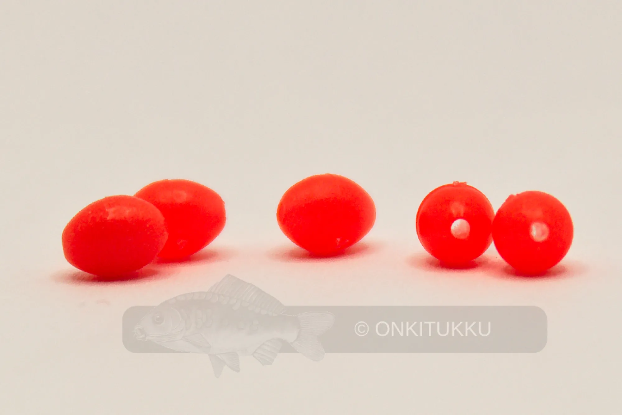 Punainen pimeässä lievästi oranssina hohtava reiällinen fosforihelmi. Helmi on ovaali Koko 4 x 5 mm. Pussissa 100kpl