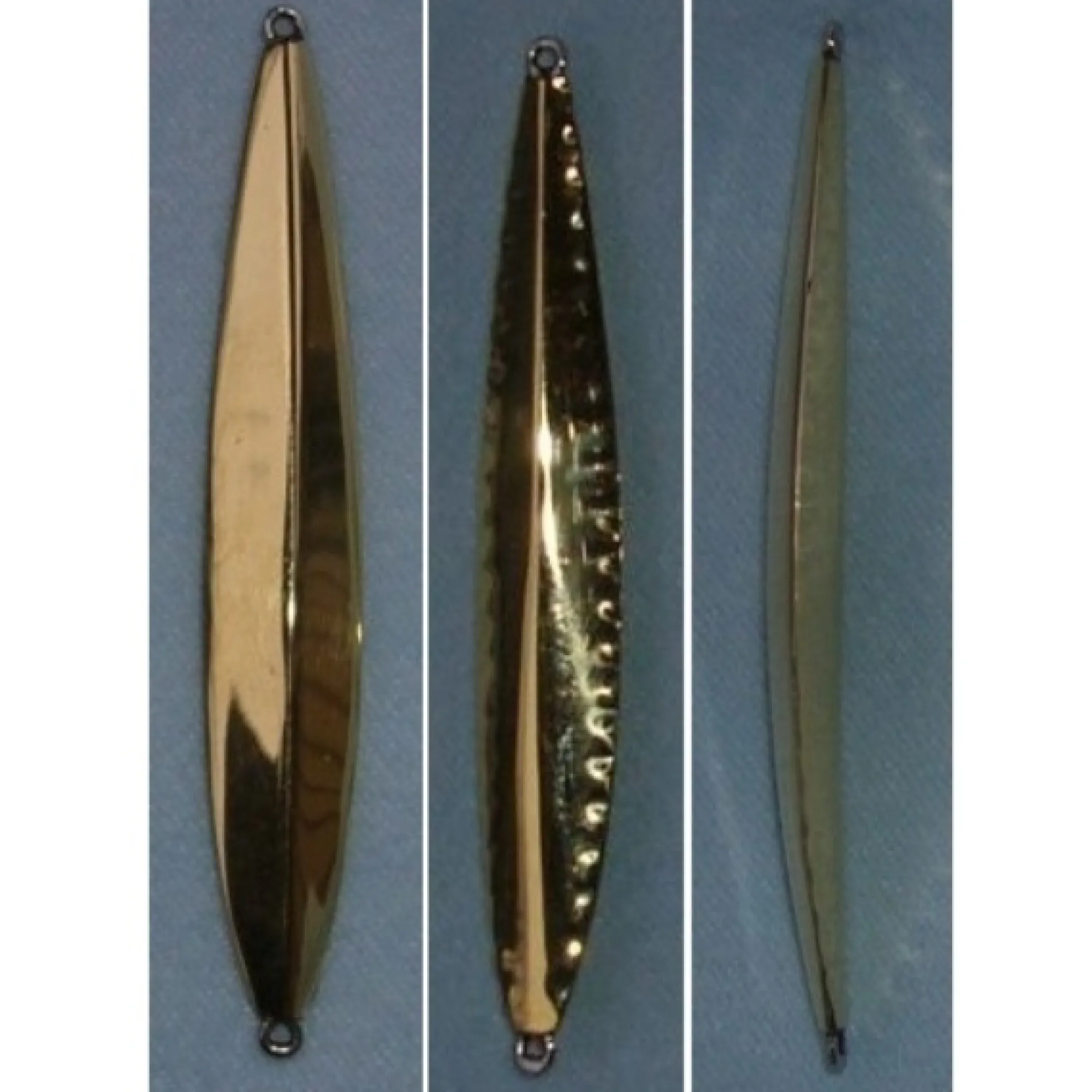 Käsin tehty pelti-pystypilkki. Vatsapuoli on vekattu värinän lisäämiseksi. Pilkki on valmiiksi taitettu. Pituus lenkkien päähän 60mm Leveys on 9mm Paino 7g Väri: messinki