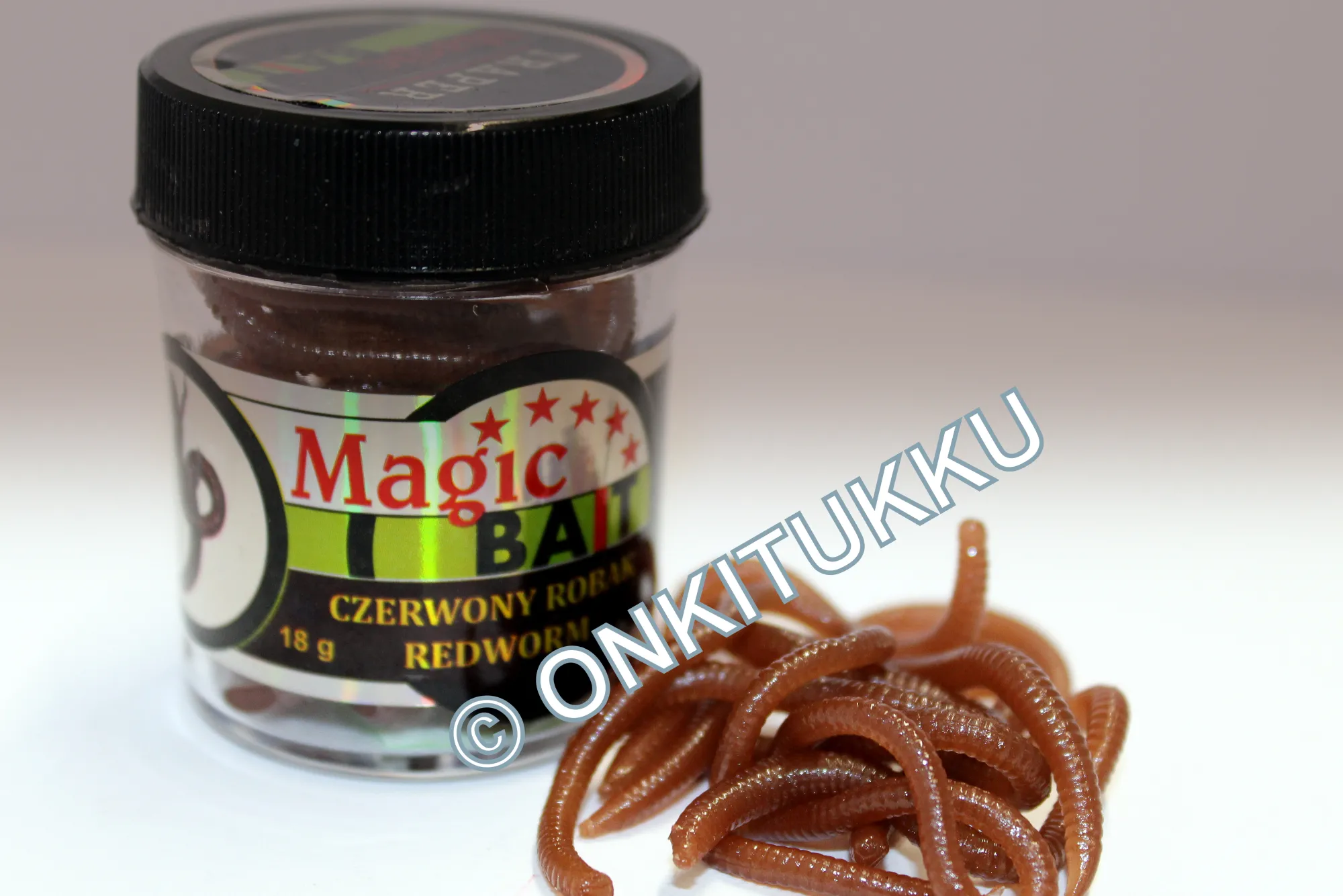 Keinotekoisia hajustettuja matoja. Ulkonäöltään luonnollistamatoa imitoiva tuote. Pehmeä koostumus jonka ansiostamato on helppo pujoittaa koukkuun. Ota aina mukaan kalaretkelle näitä, niin syötit eivät lopu kesken. Purkissa on 18g.