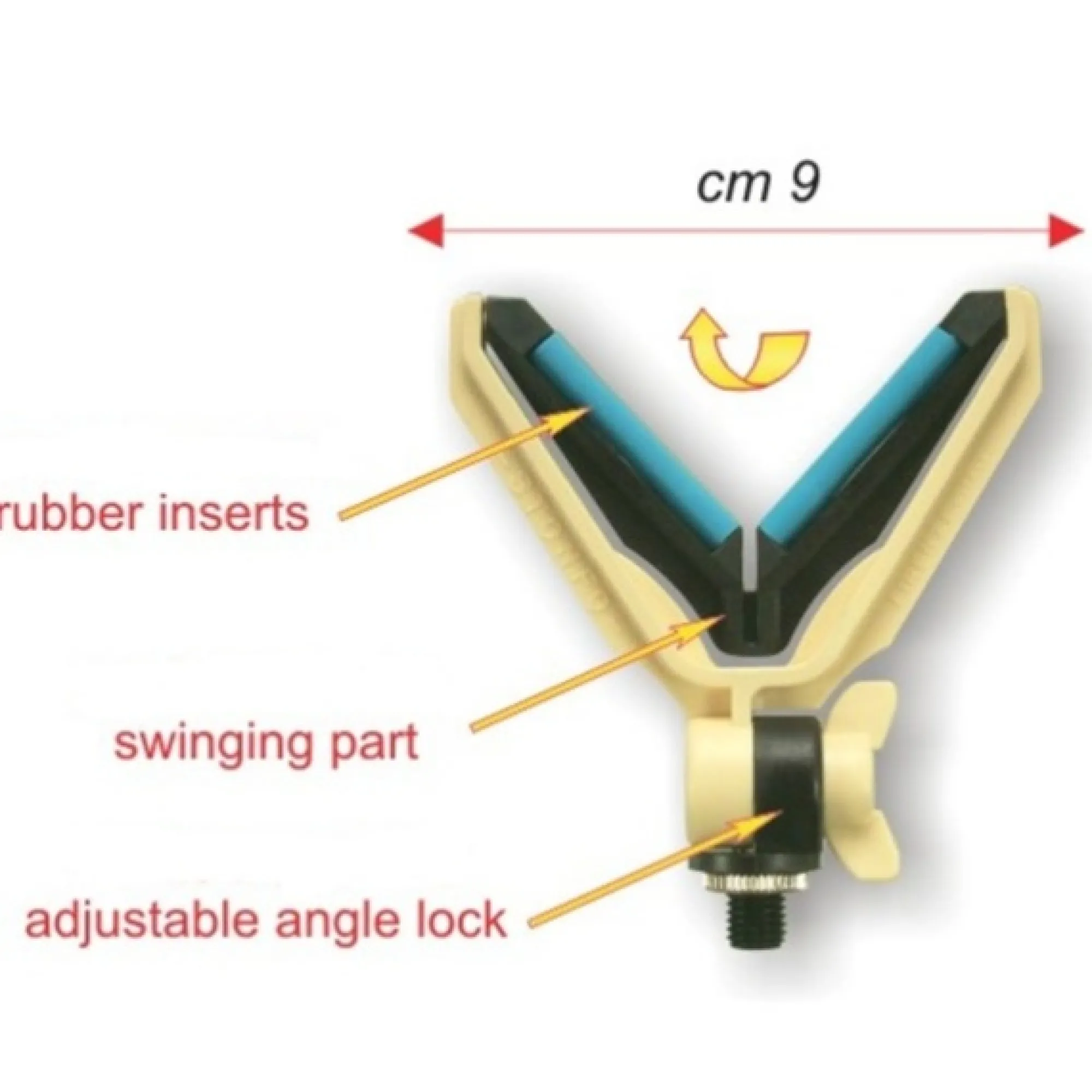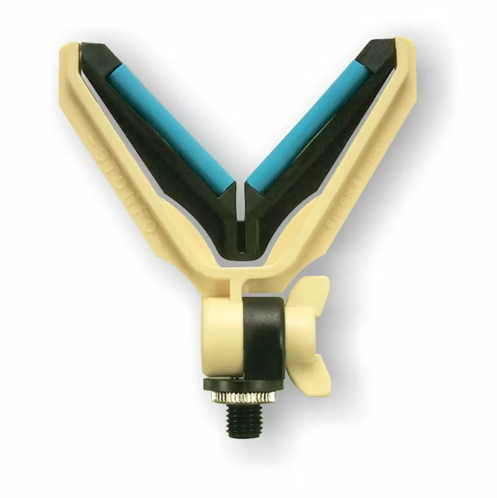 Pehmustettu V-tuki. Kallistuskulma on säädettävissä.