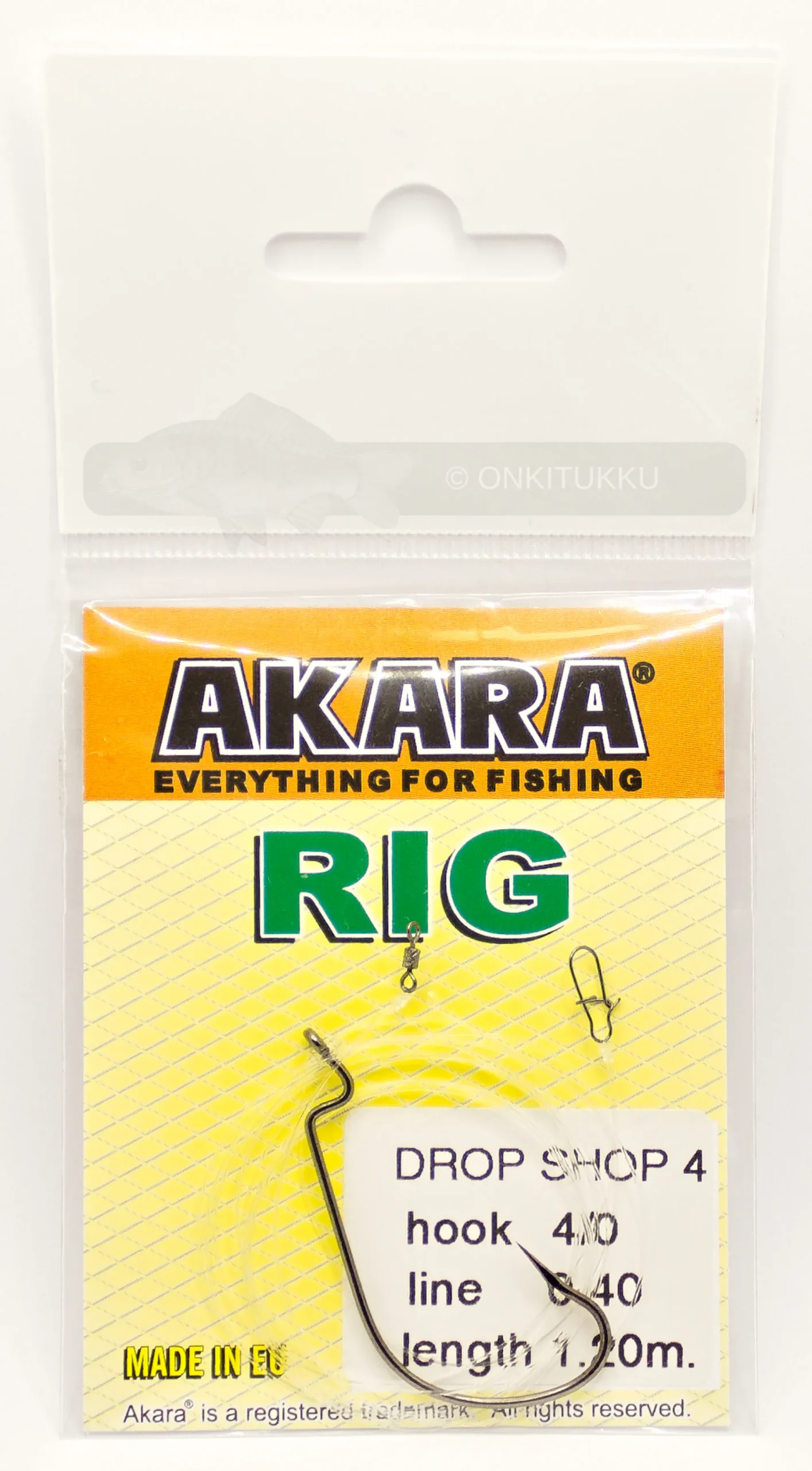 Akaran Drop shot rigi. Kemiallisesti teroitettu hiiliteräs offset koukku. Siimassa on snap lukko, ja tynnyrileikari.
