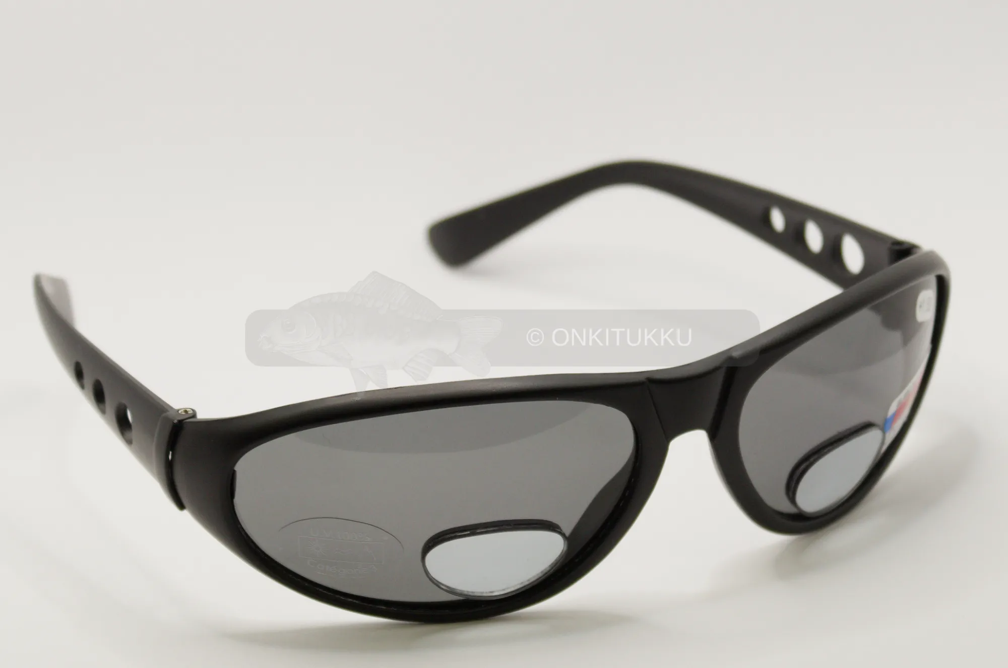 UV 400 suojatut ja polarisoidut aurinkolasit joissa on savunväriset 0,8mm linssit. Suurentava pienempi lukulasilinssi vahvuudeltaan +3,5