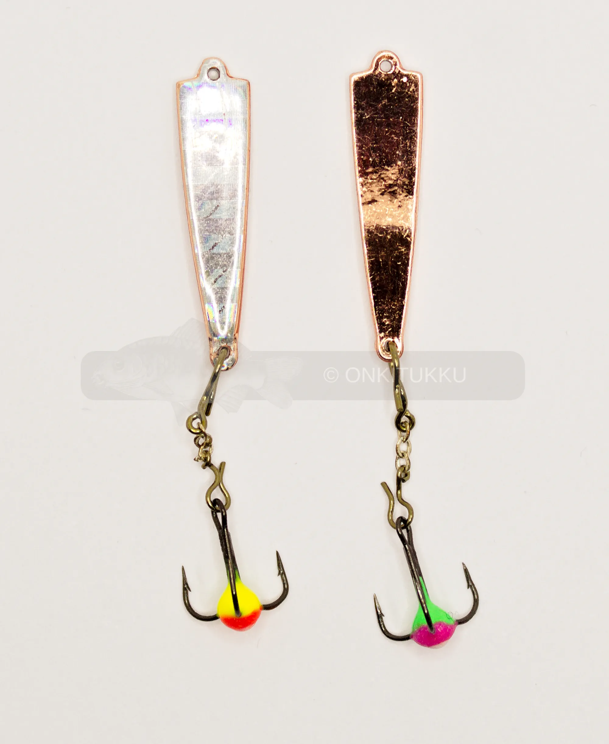 Tyylikäs volframi pystypilkki kolmihaarakoukulla. Kuparin värinen ja toisella puolella hopeahologrammi.