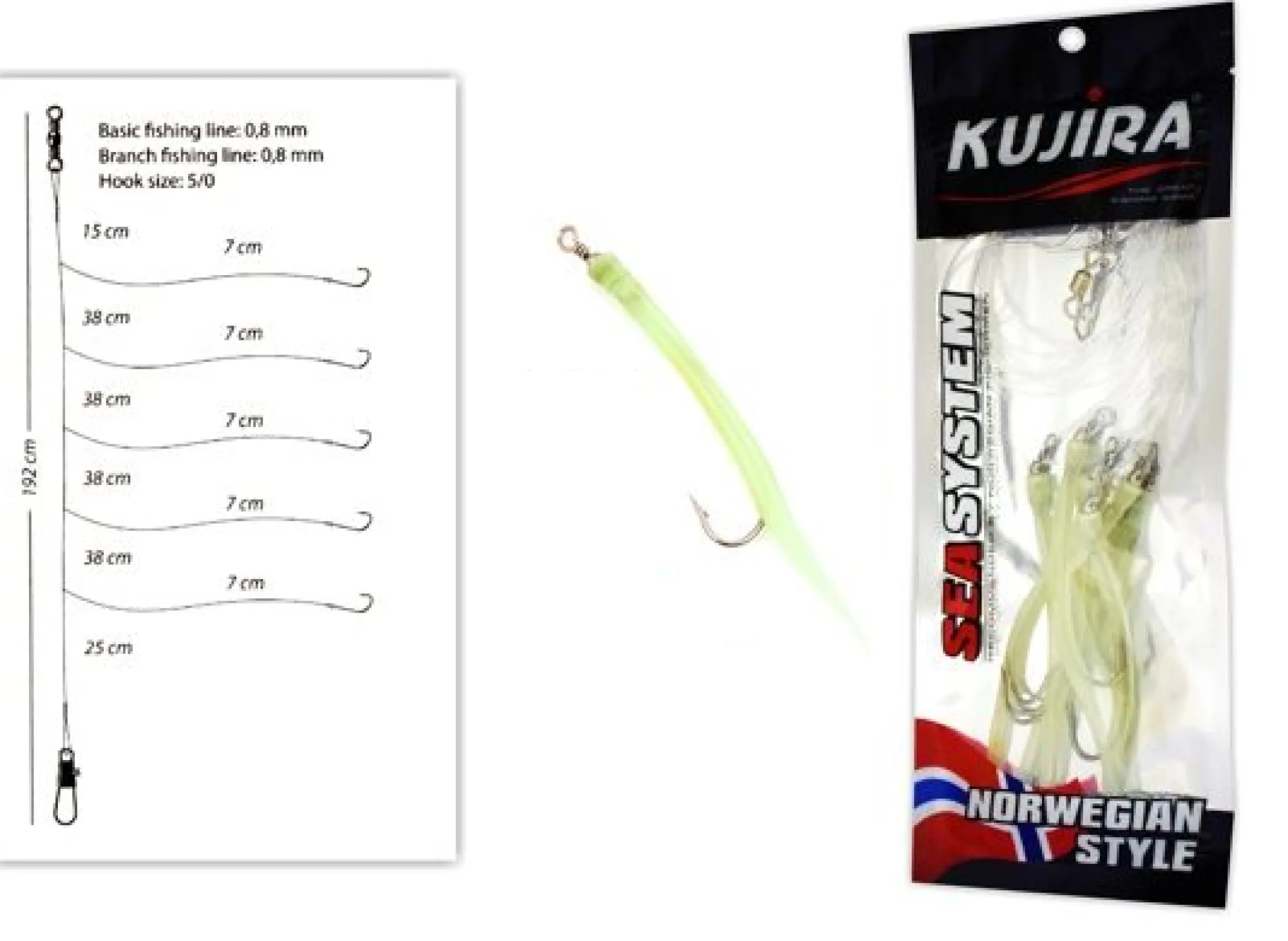 Kirkas siima paksuus 0,8mm. Koukkujen päällä pimeässä hehkuva kumi syötti. Litkan pääsimassa on snaplukko ja tynnyrileikari. 5 kpl koukkuja.