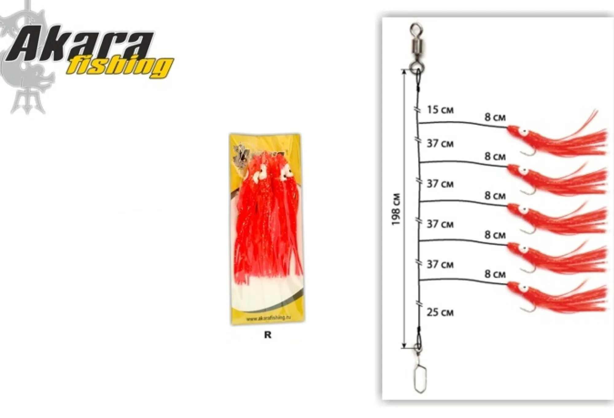 Kirkas siima paksuus 0,8 mm. Koukkujen päällä punainen mustekala syötti. Punainen väri toimii erittäin hyvin pun…