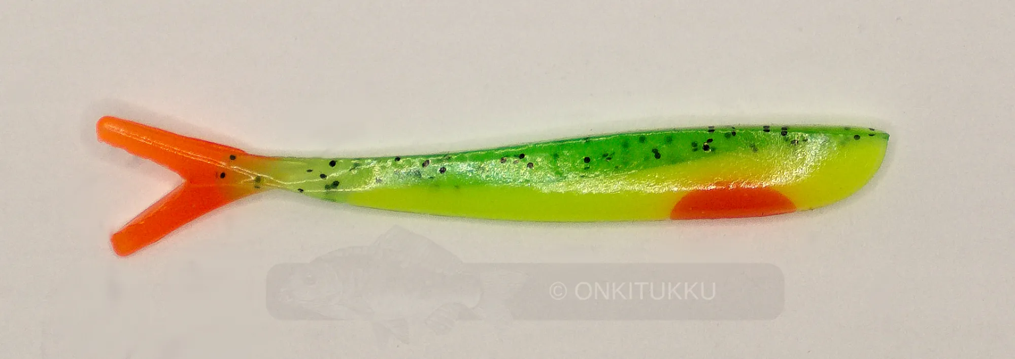 Kolmivärinen haarapyrstöinen kalajigi. Vihreä selkä mustilla hileillä, alapuolelta keltainen oranssilla läikällä ja oranssilla pyrstöllä. Venyvyys noin 40%. Erittäin hyväksi todettu malli kuhalle ja ahvenelle. Pussissa 4kpl