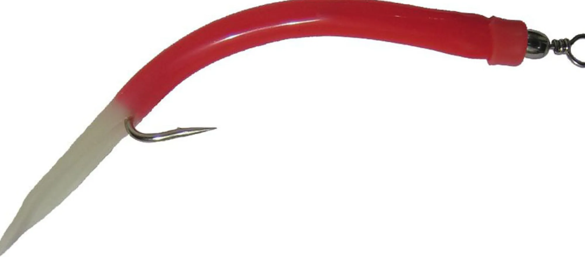 Pimeässä hehkuva kumimato koukulla ja tynnyrileikarilla. Koukun koko 8/0 Paketissa 4 kpl