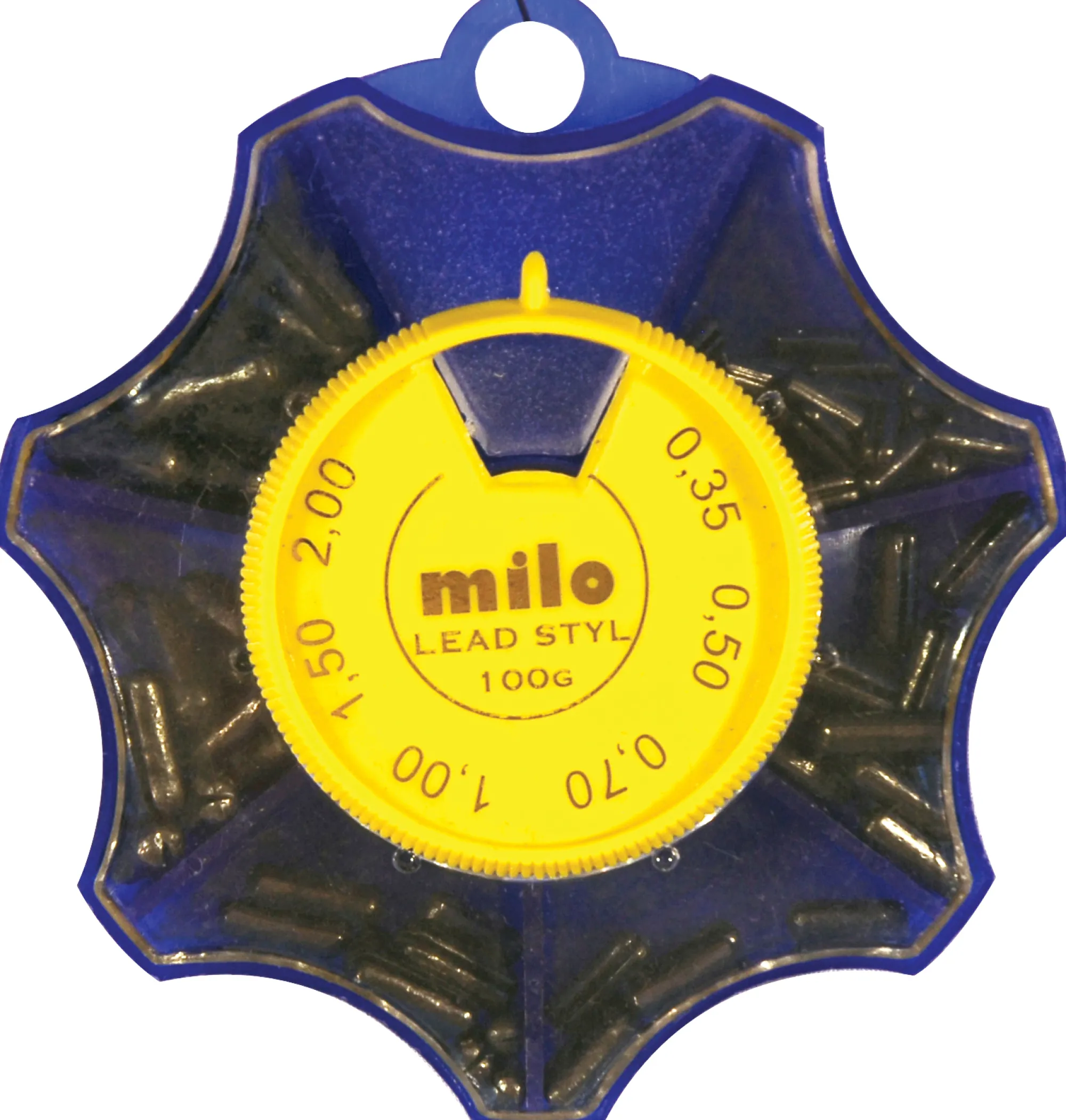 Pehmeitä kapselin muotoisia halkaistuja lyijypainoja tukevassa rasiassa. Painoja on kuutta eri kokoa. Rasiassa on yhteensä 100g. Haulikoot:0,5g 0,7g 1,0g 1,25g 2,1g ja 3,0g