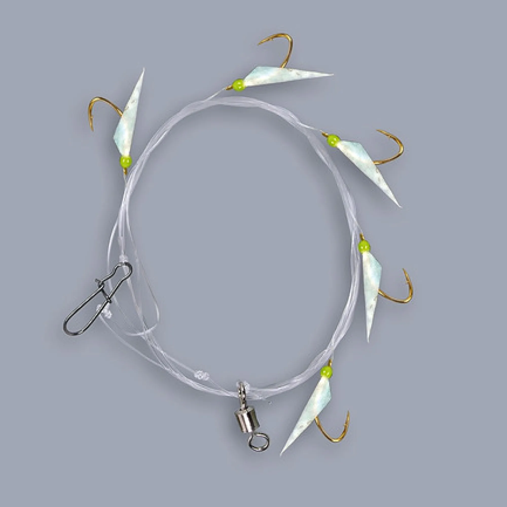 Silakkalitka viidellä kullan värisellä koukulla joiden ympärillä kalannahka imitaattio.