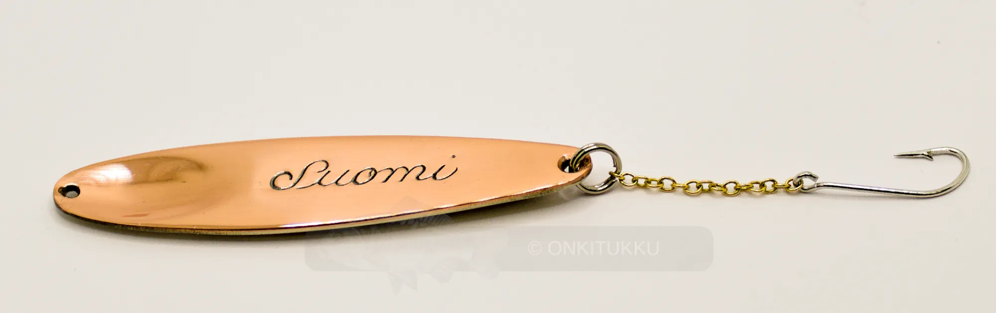 Suomi-pilkistä on tullut monen kuhapilkkijän vakioviehe. Pilkissä on vakiona kirkas ketjukoukku, jota kannattaa vaihtaa värikoukkuun. Puustjärvi on valmistanut pilkkejä jo 50-luvulta asti.